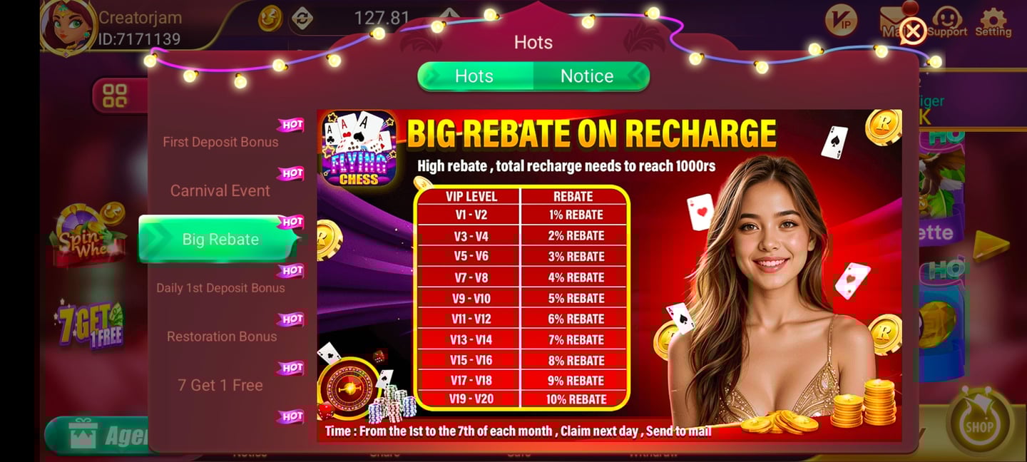 Flying Chess is rewarding loyal players with a high-value rebate when they recharge their accounts. The more you play and recharge, the higher your VIP level climbs and the bigger your rebate percentage becomes.
