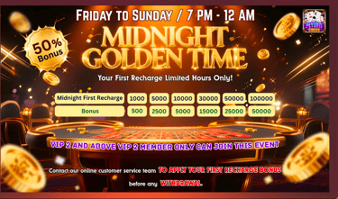 “Midnight Golden Time” is a special recharge event for VIP 2 and above players in the Flying Chess App. During this event window (7 PM – 12 AM, Friday to Sunday), players can receive an instant bonus of up to 50% when they make their first recharge.