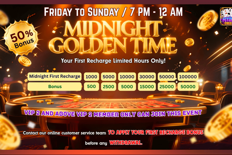 Are you ready for an exciting weekend filled with nonstop entertainment and unbeatable rewards? The Flying Chess Casino Game is thrilled to announce its brand-new feature — Midnight Golden Time, a limited-time recharge event that gives players a 50% bonus on their first recharge!